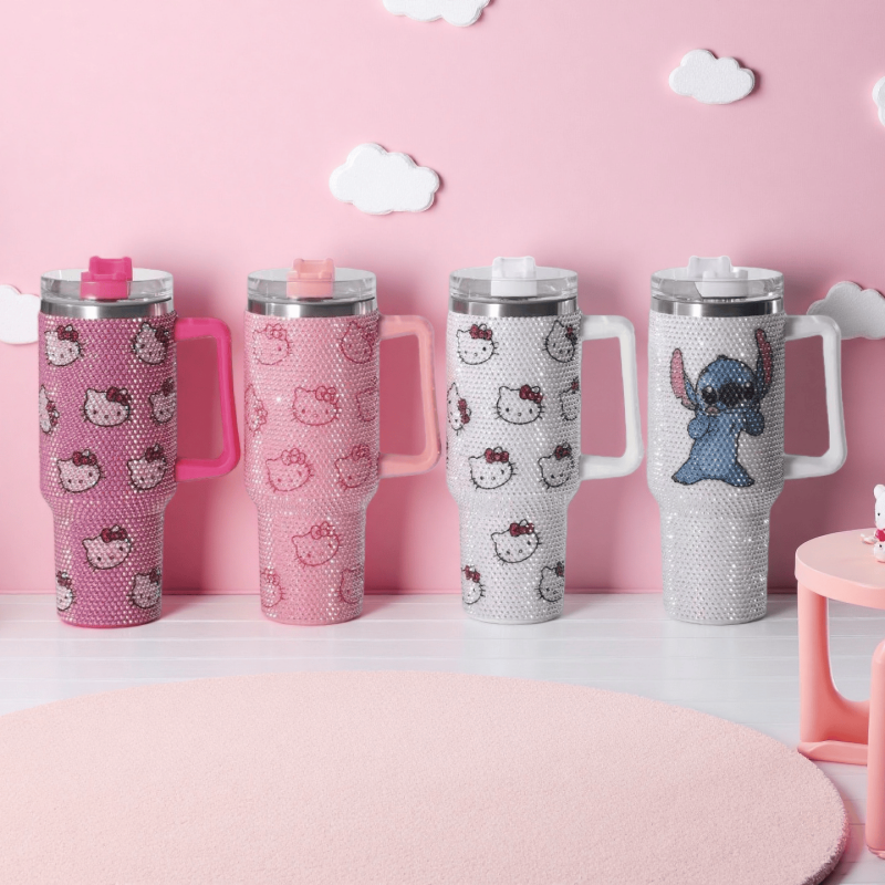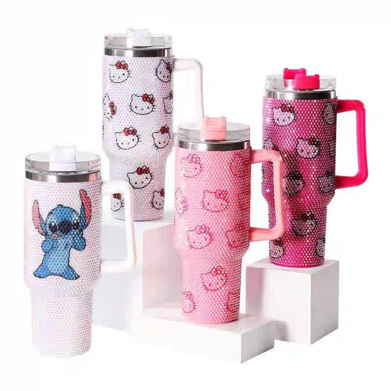 40 Oz Hellow kitty Rhinestone Studded Tumbler with Handle Straw and Lid, Insulated Stainless Steel Double Layer Water Bottle for Women, Reusable Travel Coffee Mug