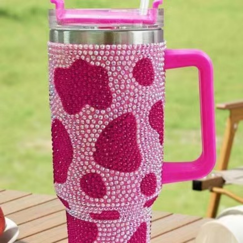 Cow Print Rhinestone Insulated Tumbler with Handle & Straw - Sparkly Glam Design for Home & Travel | Keep Drinks Hot/Cold | Trendy Kitchen & Lifestyle Must-Have